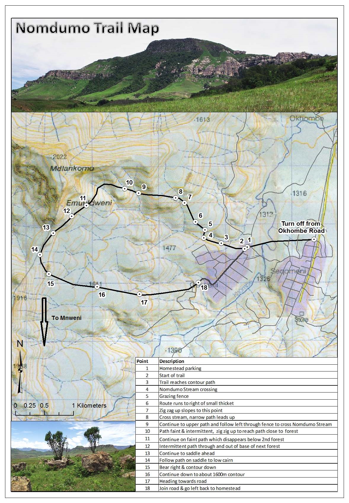 The trail is exploratory is nature. Sections of the trail are either cross-country or have intermittent paths. It follows the left upstream banks of Nomdumo Stream to a series of cascades before heading up the eastern slopes of uMdlankomo to pass by Hlathin’elide (Long Forest) and Amahlathin’amathathu (Three Forests) before providing access into Mnweni (AmaNgwane Traditional Authority Area) or the AmaZizi Valley of Busingatha, with which it shares a common boundary. Part of the trail falls within the proposed Community Nature Reserve & Wilderness Area.